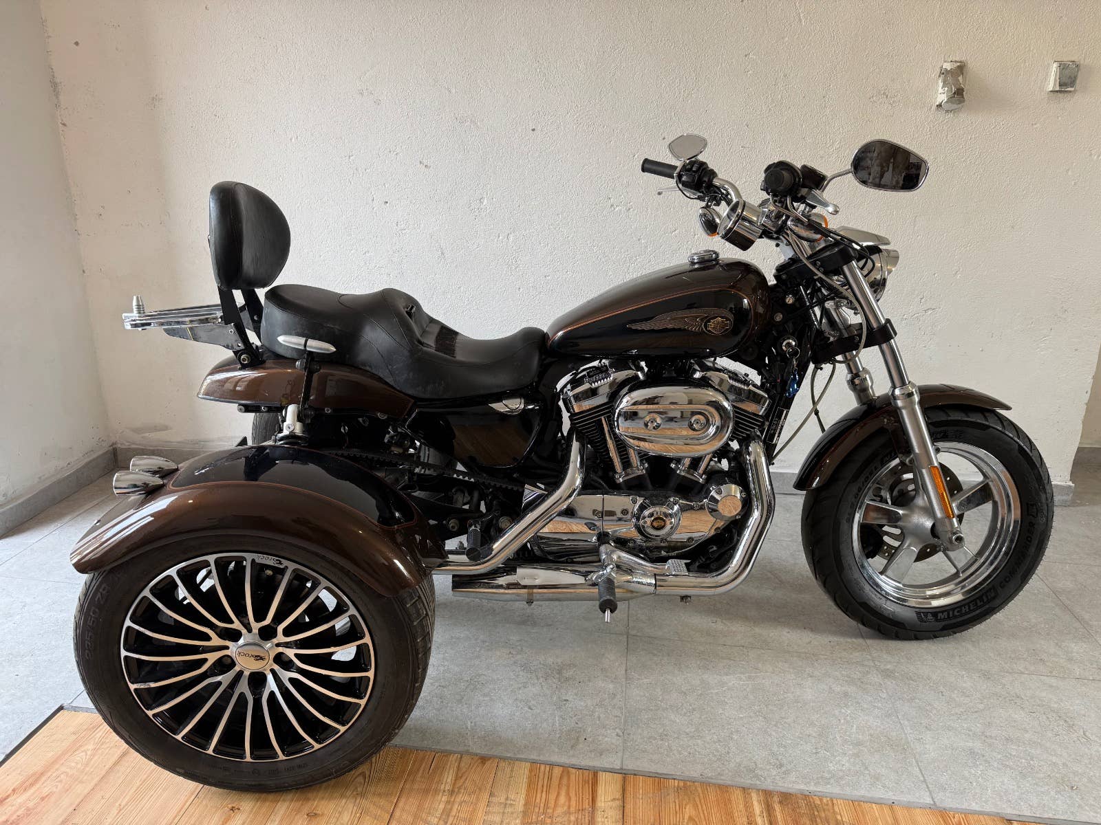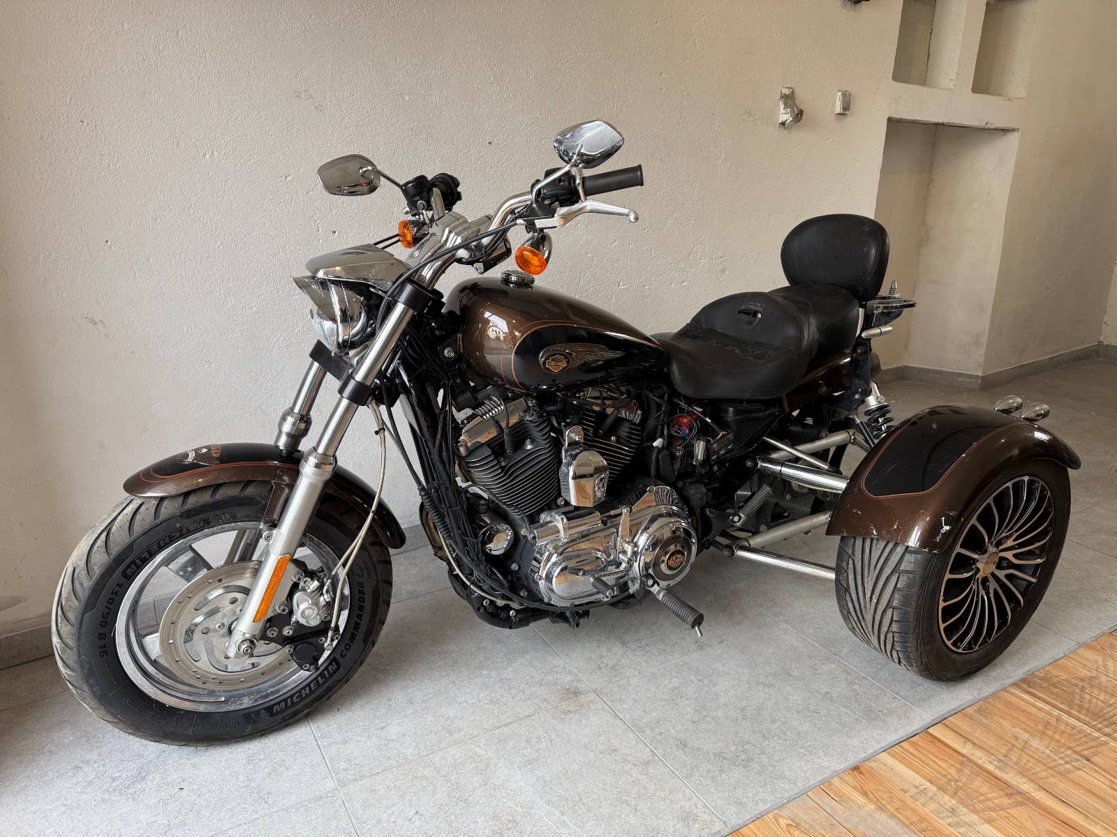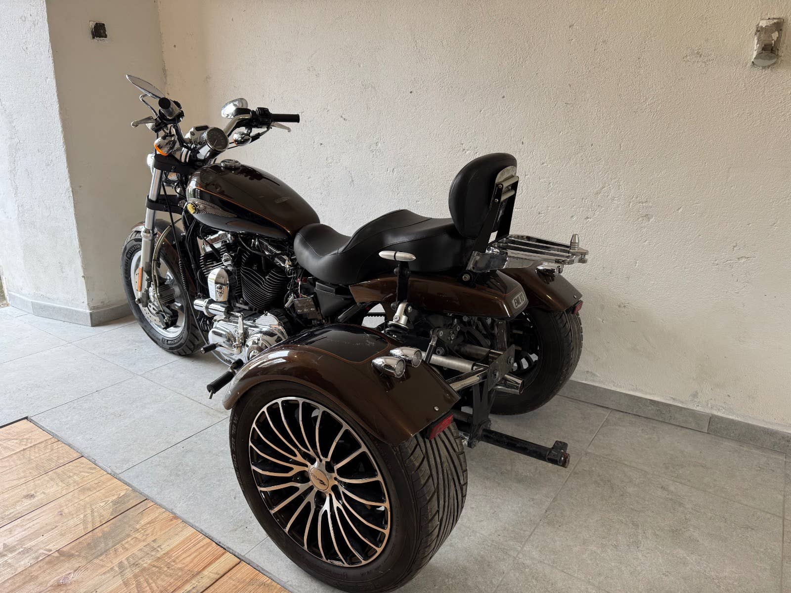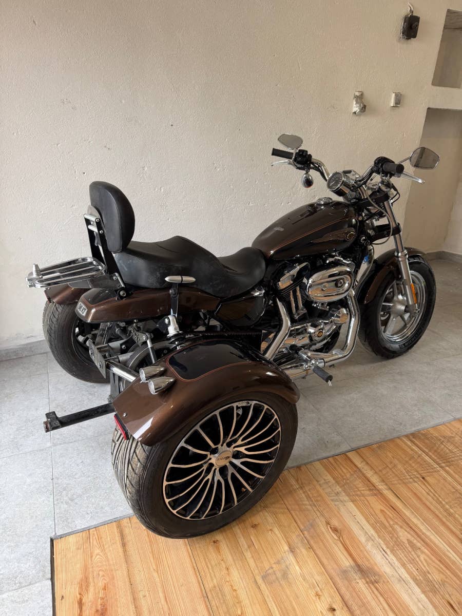 Havarovaný Harley Davidson Sportster Custom 1200 TRIKE, 2013, najeto 23 tisíc km, havarovaný na předek, nejluxusnější možná přestavba na trike provedena od nového stroje holandskou firmou W-Tec B. V., vše oficiální, typ EML V3, Vše homologované atp.. automatické řazení od firmy PINGEL, s ovládáním na řidítkách, zadní kufr na opravu, lze provozovat i bez kufru. Jedná se o evropskou verzi TRIKE.. cena tříkolky v případě ojetého stroje je cca. 20 000-22000€.